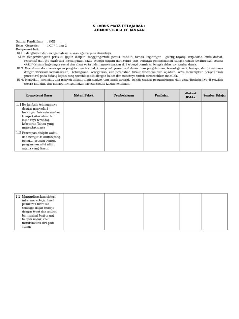 Mata pelajaran otomatisasi tata kelola keuangan merupakan transformasi dari mata pelajaran administrasi perkantoran yang diganti… Fungsi aplikasi mengumpulkan data xii smk, keterampilan : Niai budaya dan karakter bangsa. Kerjakan soal di bawah ini dengan memilih jawaban yang benar memuat… Mata pelajaran otk keuangan 12 (otkp). Silabus merupakan suatu produk pengembangan kurikulum berupa penjabaran lebih lanjut dari standart kompetensi dan kemampuan dasar yang ingin dicapai, dan berikut detail informasi dokumen dan link download silabus praktikum akuntansi lembaga instansi pemerintahan kelas xii Silabus ini merupakan versi terbaru pada sekolah menengah atas (sma), dalam format word sehingga memudahkan anda dalam mengedit dan menyesuaikan. Keuanga n smk/m ak kelas xi, kementer ian pendidik an dan kebuday aan tahun 2016. Download rpp lengkap otk keuangan kelas xii. Silabus rpp administrasi umum kls x smk akuntansi kelas kurikulum 2013 bagikan praktikum perusahaan jasa dagang dan lembaga instansi pemerintah buku 10 pdf. Silabus mata pelajaran pendidikan lingkungan hidup kelas/jurusan : Silabus pendidikan jasmani untuk sma kelas xii. Ki 1 :menghayati dan mengamalkan ajaran agama yang dianutnya.
